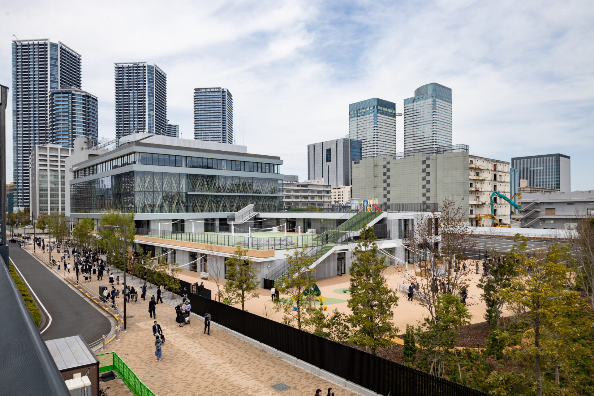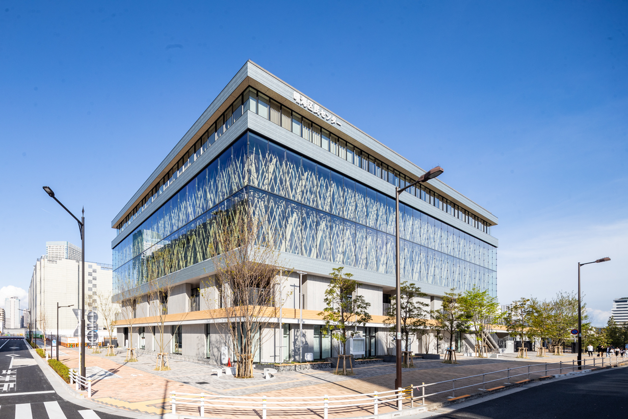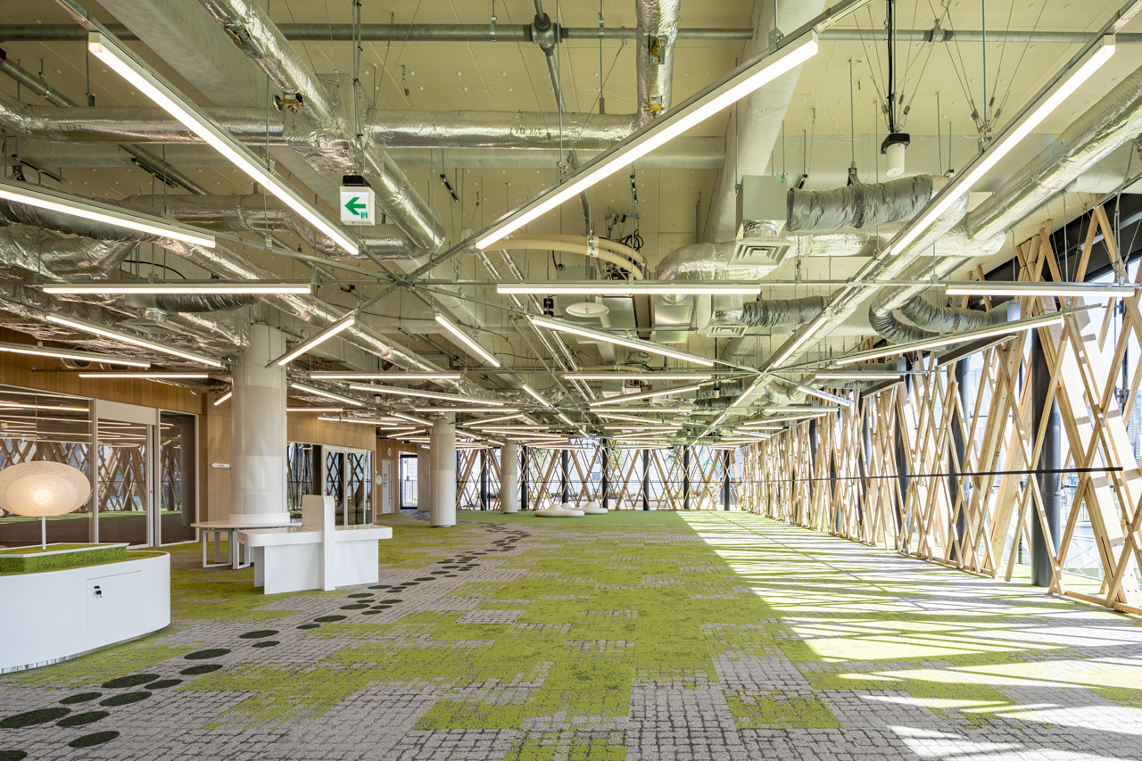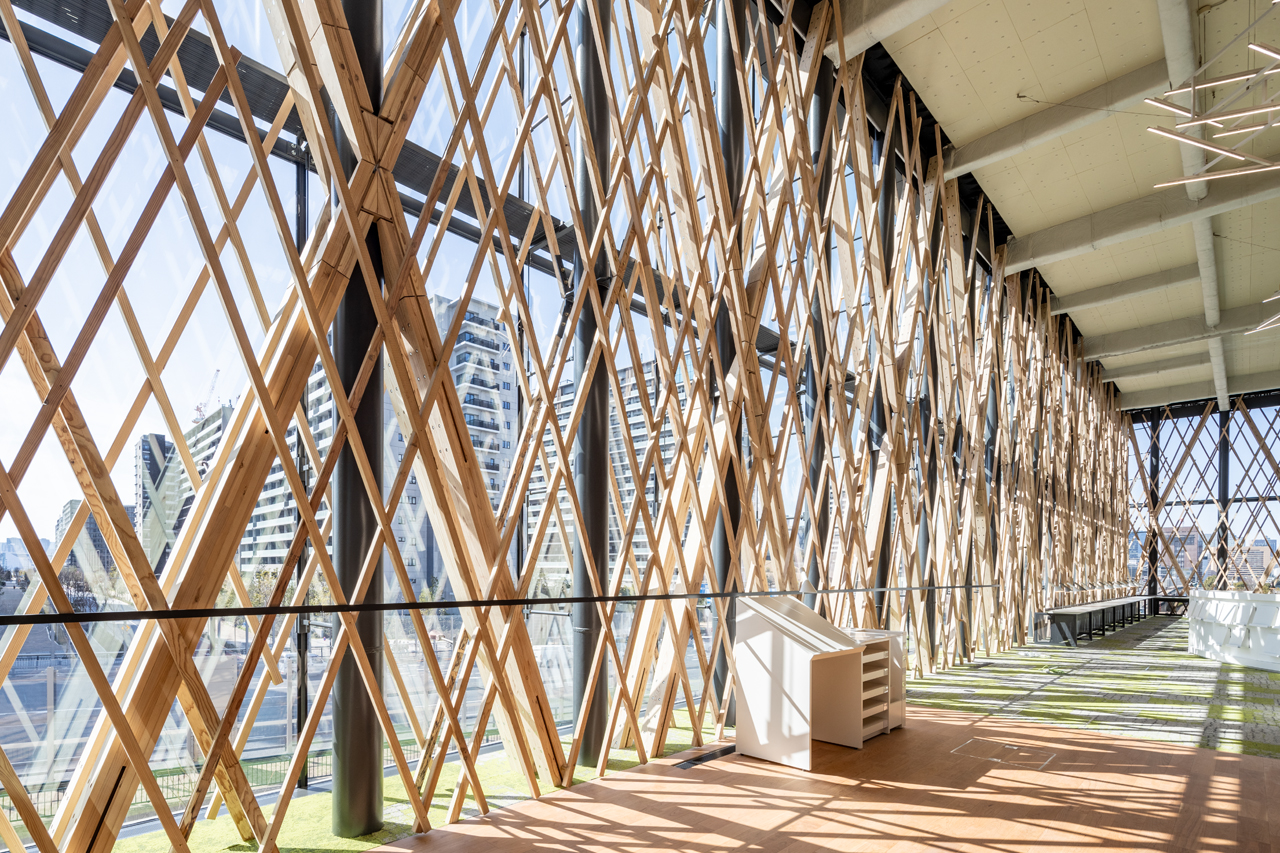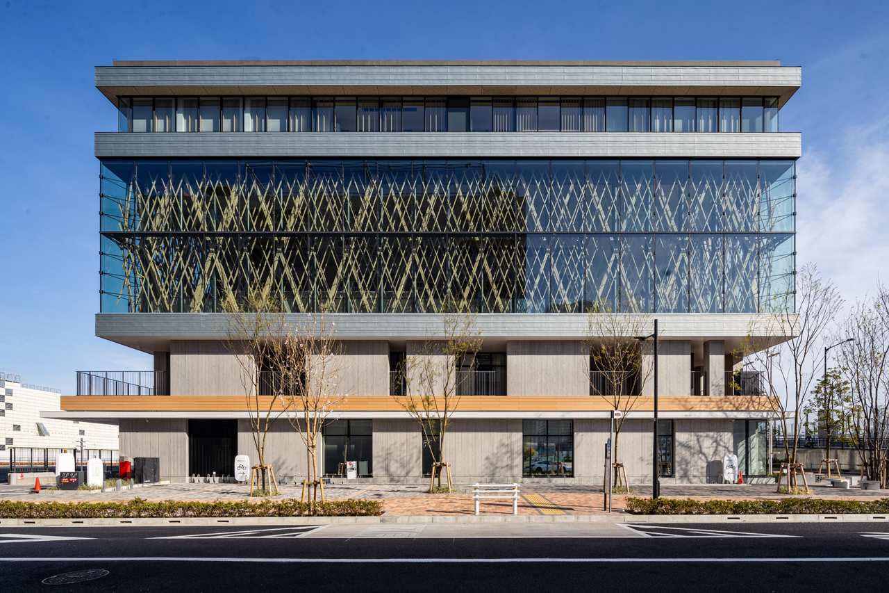 TOKYO2020で利用されたビレッジプラザの木材が{木材リレー」の一環として当施設の木ルーバー(Branch)に使用されいます。このルーバーは耐震ブレース集成材と組み合わされ、街を見守る「樹冠」のシルエットとなっています。
