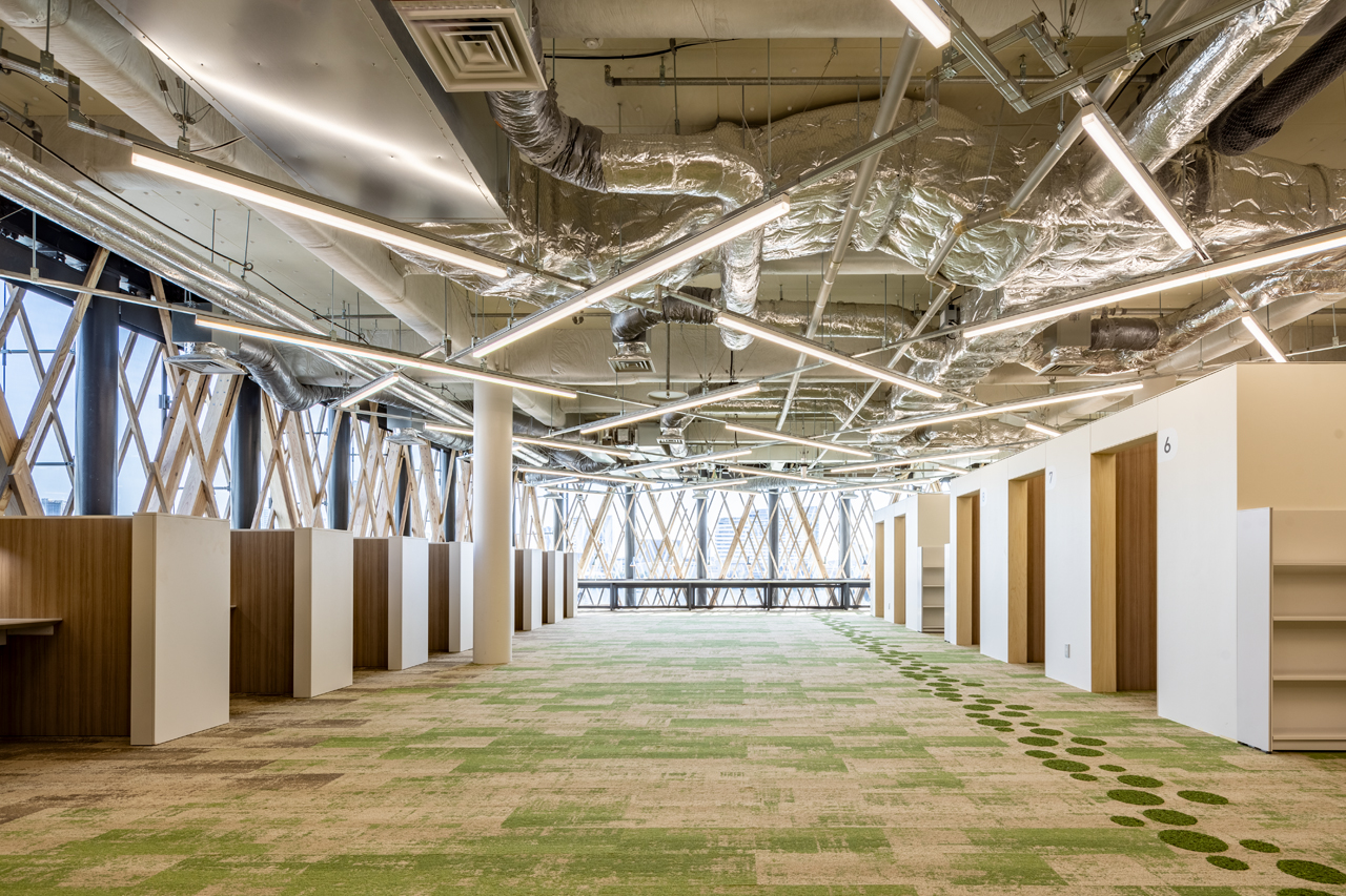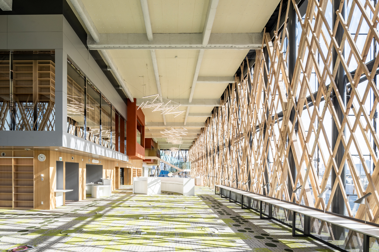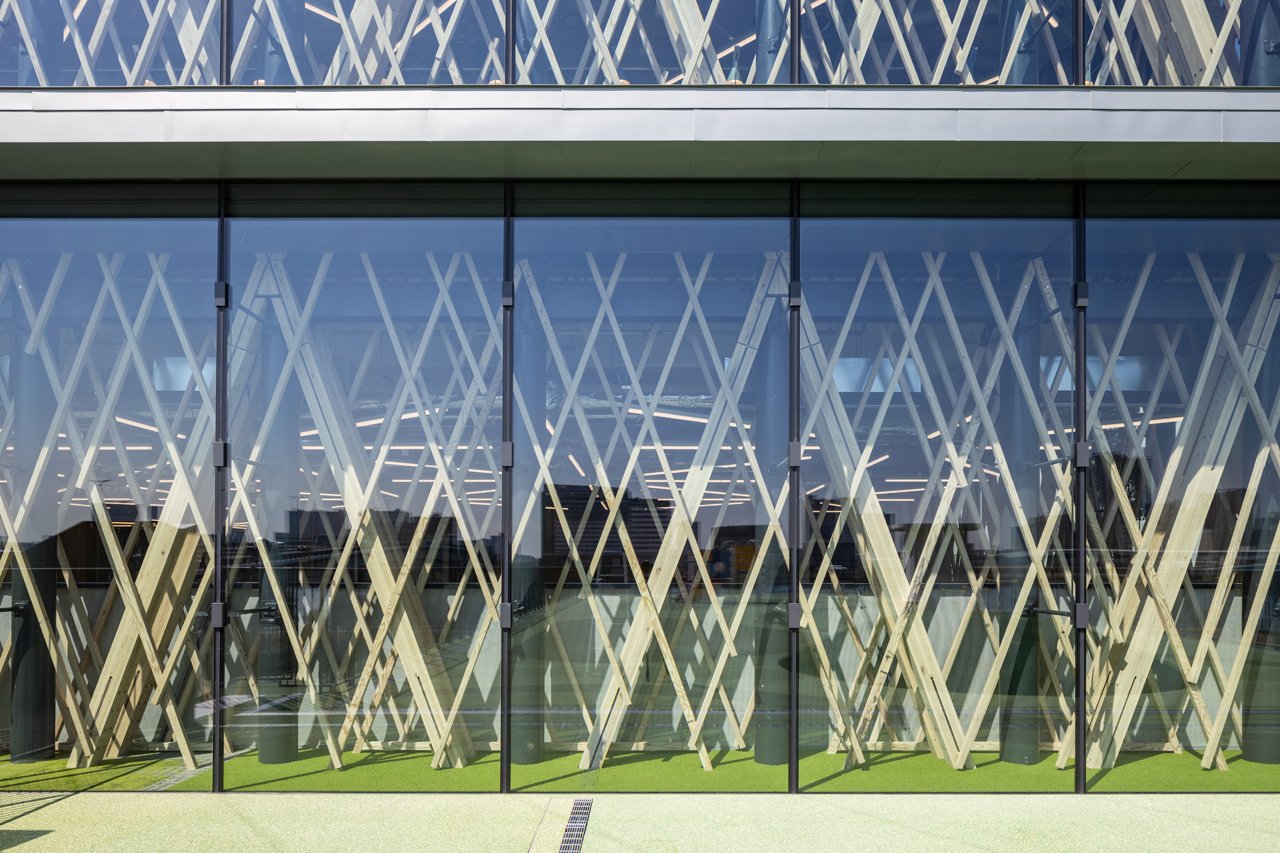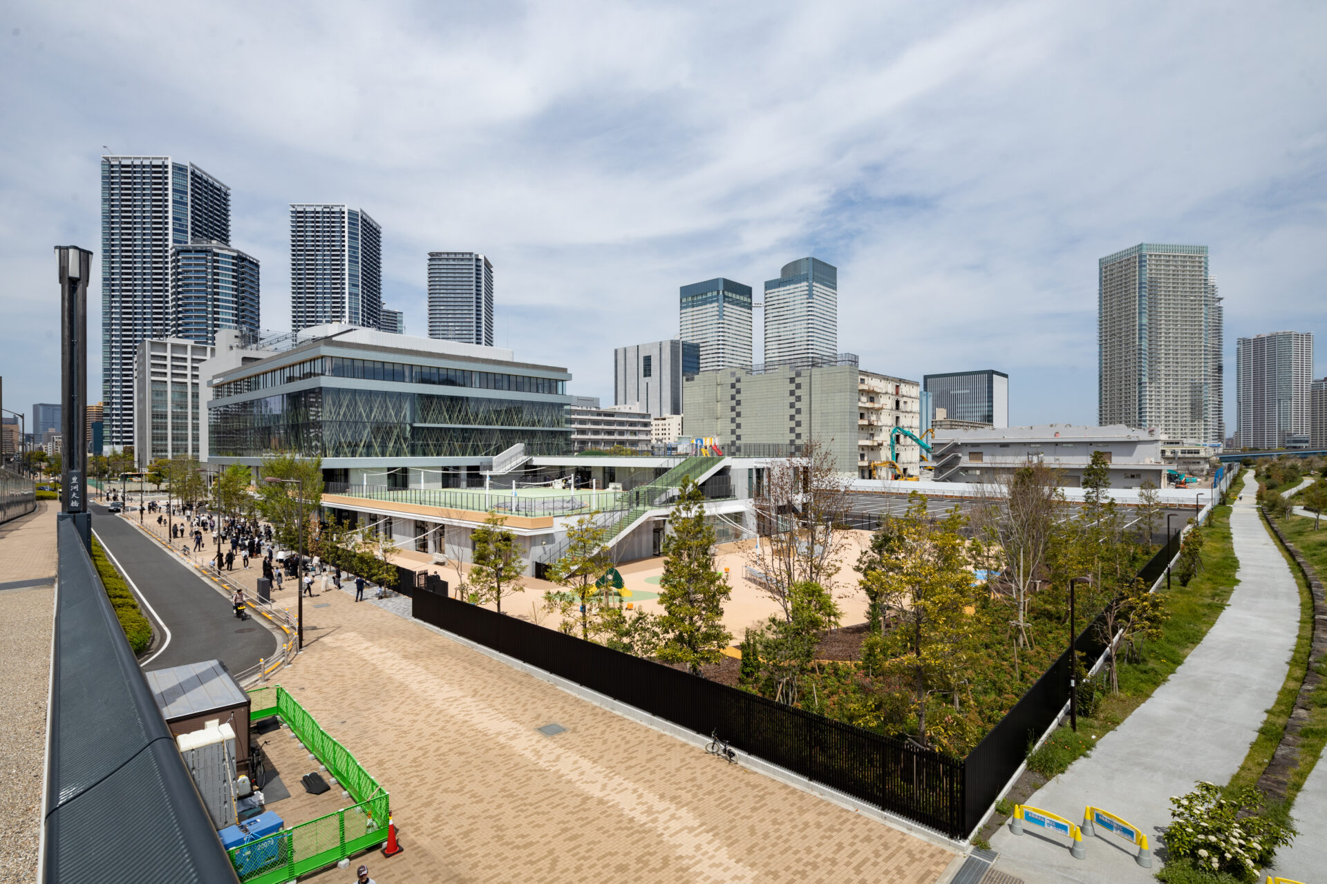 TOKYO2020で利用されたビレッジプラザの木材が{木材リレー」の一環として当施設の木ルーバー(Branch)に使用されいます。このルーバーは耐震ブレース集成材と組み合わされ、街を見守る「樹冠」のシルエットとなっています。