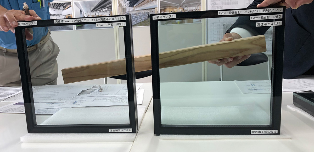 この「樹冠」を自然な形で見せる為、できるだけ透明で視線の邪魔をしないものでありながら、高い環境性能も併せ持つガラスの壁を設計する事が求められました。その結果高透過ガラスのLow−E複層ガラスと束材支持のEPGを使用したファサードが採用され、室内から木漏れ日のような優しい光が街路に落ち、街の人が安心して使用出来る施設となっています。